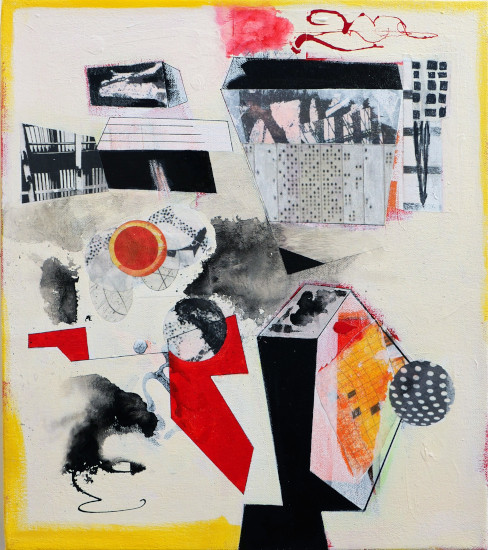Stages 16 x 14, acrylic and collage on canvas, 2025